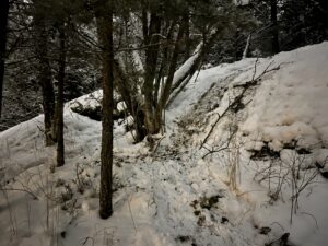 Kävimme Astan kanssa keräämässä rastit pois vielä kisan jälkeen ja yksi parhaista ratamestarille kuuluvista iloista näin talvella on suunnistajien reittien tutkiminen lumisessa maastossa. Ratoja pöydän ääressä suunnitellessa usein miettii mahdollisia erilaisia reitinvalintoja mutta niinhän se taitaa olla, että suunnistaja menee vuodenajasta riippumatta suoraan. Tästä esimerkkinä A- ja B-radan jyrkännerasti 214, jolle reitinvalintana oli kierto kadun kautta tai pari reittiä polkuja pitkin metsän läpi. Tulosuunnassa vasemman kautta (kuvassa oikealta) tulee parikin selvää polkua hieman rinteen ohi suoraan puussa olleelle rastille, mutta eihän suunnistajalla ole aikaa kierrellä ja lopputulos näyttää tältä: