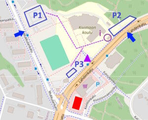 Pysäköinti ja ilmoittautuminen sijaitsevat Kivimaan koululla osoitteessa Lahdenkatu 62 ja niiden sijainnit käyvät ilmi alla olevasta kuvasta. Ilmoittautuminen sijaitsee parkkialueella P2 i-kirjaimella merkityn ympyrän kohdalla. Laitamme pysäköintiin ohjaavat opasteet niin, että alueille P1 ja P2 osoittaa yökupin viitta heijastimineen sekä rastilippu. Ensisijainen pysäköintialue on P1, jolle sisäänajo tapahtuu Mukkulankadun puolelta. Alueella on iltaisin muitakin käyttäjiä, mutta tarjolla on runsaasti pysäköintipaikkoja. Alueella P1 ei ole opastusta, joten pysäköinti tapahtuu vapaille paikoille alueen opasteiden mukaisesti. Jos oma tulosuunta osuu paremmin alueelle P2, sinne voi myös pysäköidä. P2-alueelle järjestetään opastus, koska paikkoja on vähemmän ja alueella on muitakin käyttäjiä. Jos P2 täyttyy, sen jälkeen ensisijainen pysäköintipaikka on P1. Jos kummallakaan alueella ei ole enää vapaita paikkoja, alueelle P3 mahtuu ehkä 15-20 autoa. Siellä ei ole erillistä opastusta, joten pysäköinti opasteiden mukaan. Lähialueilla on myös muita pysäköintipaikkoja esim. Kivimaan uimahallilla (vaaleansininen P-kirjain) ja niille voi tarvittaessa myös pysäköidä. Punaisella alueella merkitylle Lidlin parkkipaikalle ei saa pysäköidä. Suosittelemme kimppakyytejä mahdollisuuksien mukaan.
